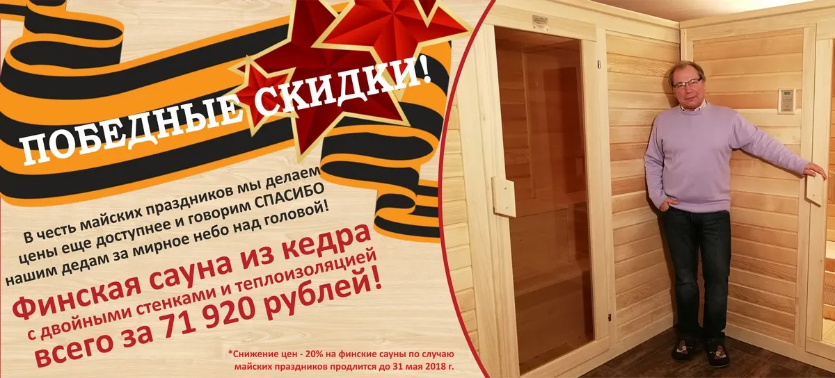 Только до конца мая приобрести финскую сауну можно всего за 71 920 рублей, что составляет -20% от обычной цены!