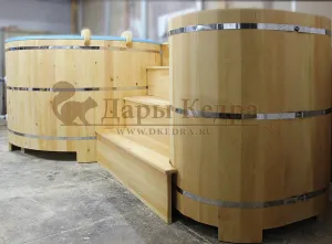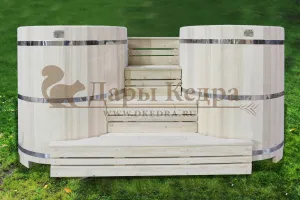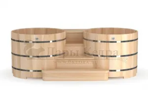 Двойная купель из кедра чаще всего используется в крупных банных комплексах и оздоровительных центрах. Она представляет собой две круглые чаши для воды, в которых люди отдыхают после парения. Между купелями установлен широкий подиум из кедра, по которому могут спускаться и подниматься сразу несколько людей. Для комфортного отдыха купель оснащена лавочками и двумя дополнительными лестницами. За счет стяжных болтов обручи из нержавеющей стали плотно прилегают к кедровой купели. Это позволяет равномерно распределять нагрузку воды и сохранить форму изделия в период эксплуатации. При правильном уходе купель для бани не рассыхается и не подвергается гниению.