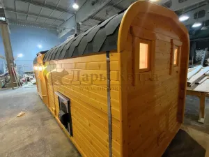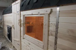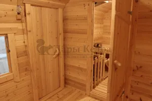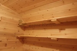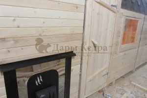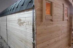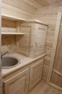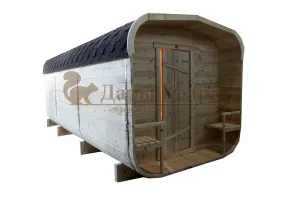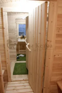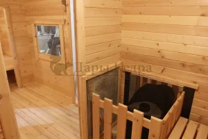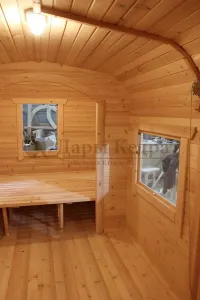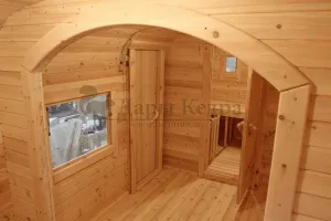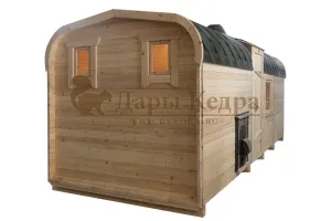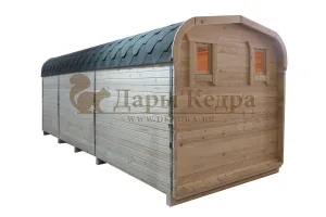 Домик с тремя помещениями подходит для дачного использования в теплое время года или обустройства загородных баз отдыха. Прихожая и кухня занимают одну комнату, в которой стоит стол из кедра. Две другие оборудованы четырьмя деревянными лежаками, по желанию их можно заменить на двуспальные кровати. Либо обустроить санузлом и душевой зоной. Для удобства пользования кемпинг дом можно укомплектовать верандой с лавочками или козырьком.