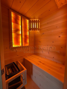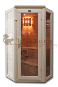 Это специально оборудованная деревянная кабина для сухого и влажного парения. Электропечь нагревает пространство внутри и позволяет сбрызгивать камни водой, слегка увлажняя воздух. Такая процедура позволяет избежать перегрева. Двойные стенки кабины с теплоизоляционным материалом удерживают тепло. Установка сауны в угол позволяет рационально использовать пространство помещения. Финская сауна с электропечью подойдет как для домашнего использования, так и для коммерции. Доставляется в разборном виде щитами, собирается по инструкции с помощью шуруповёрта.